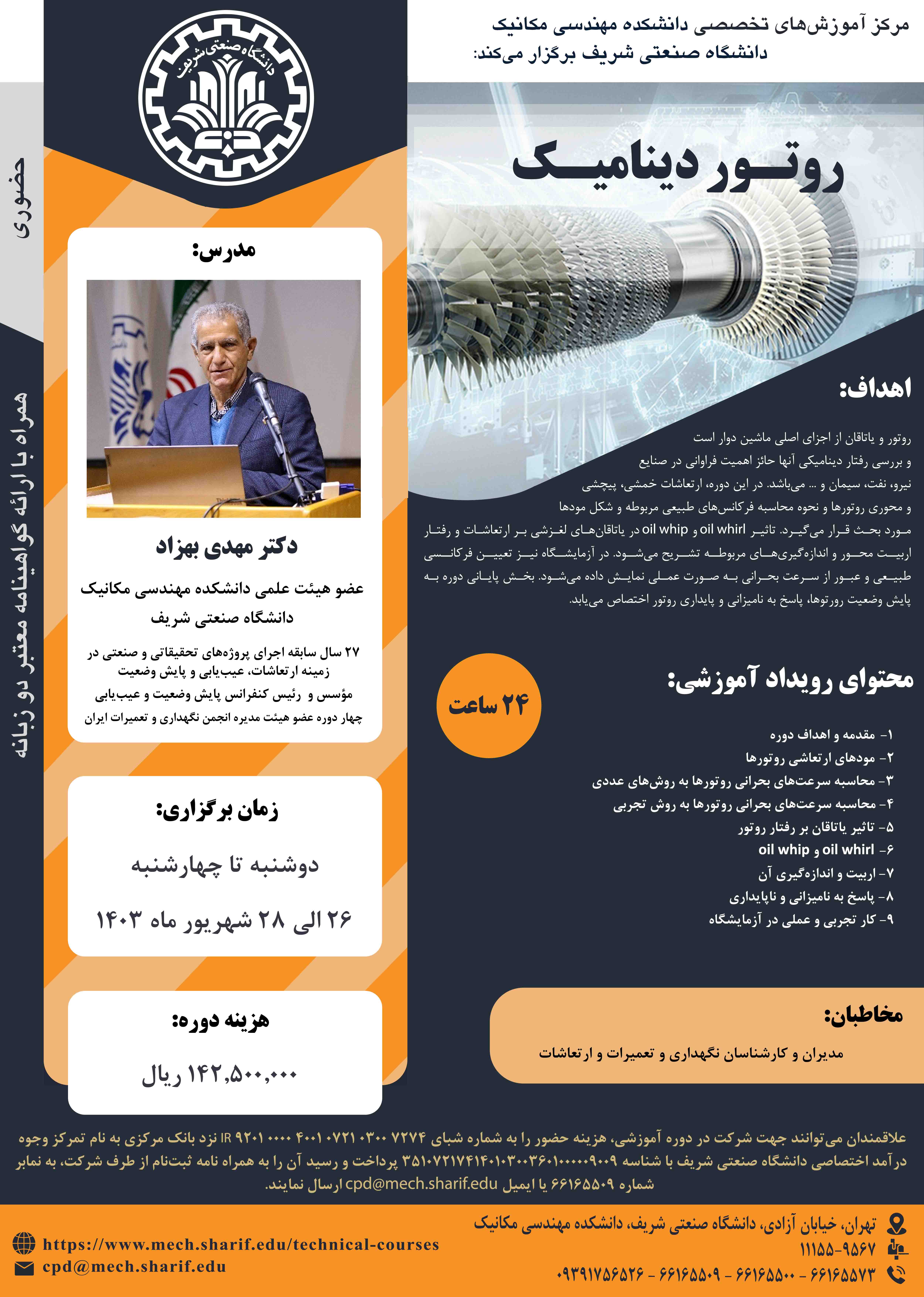 مرکز آموزشهای تخصصی دانشکده مهندسی مکانیک برگزار میکند؛ 《 روتور دینامیک 》 مدرس: دکتر مهدی بهزاد دوشنبه تا چهارشنبه، ۲۶ الی ۲۸ شهریور ۱۴۰۳ همراه با اعطای گواهینامه دو زبانه معتبر از سوی...