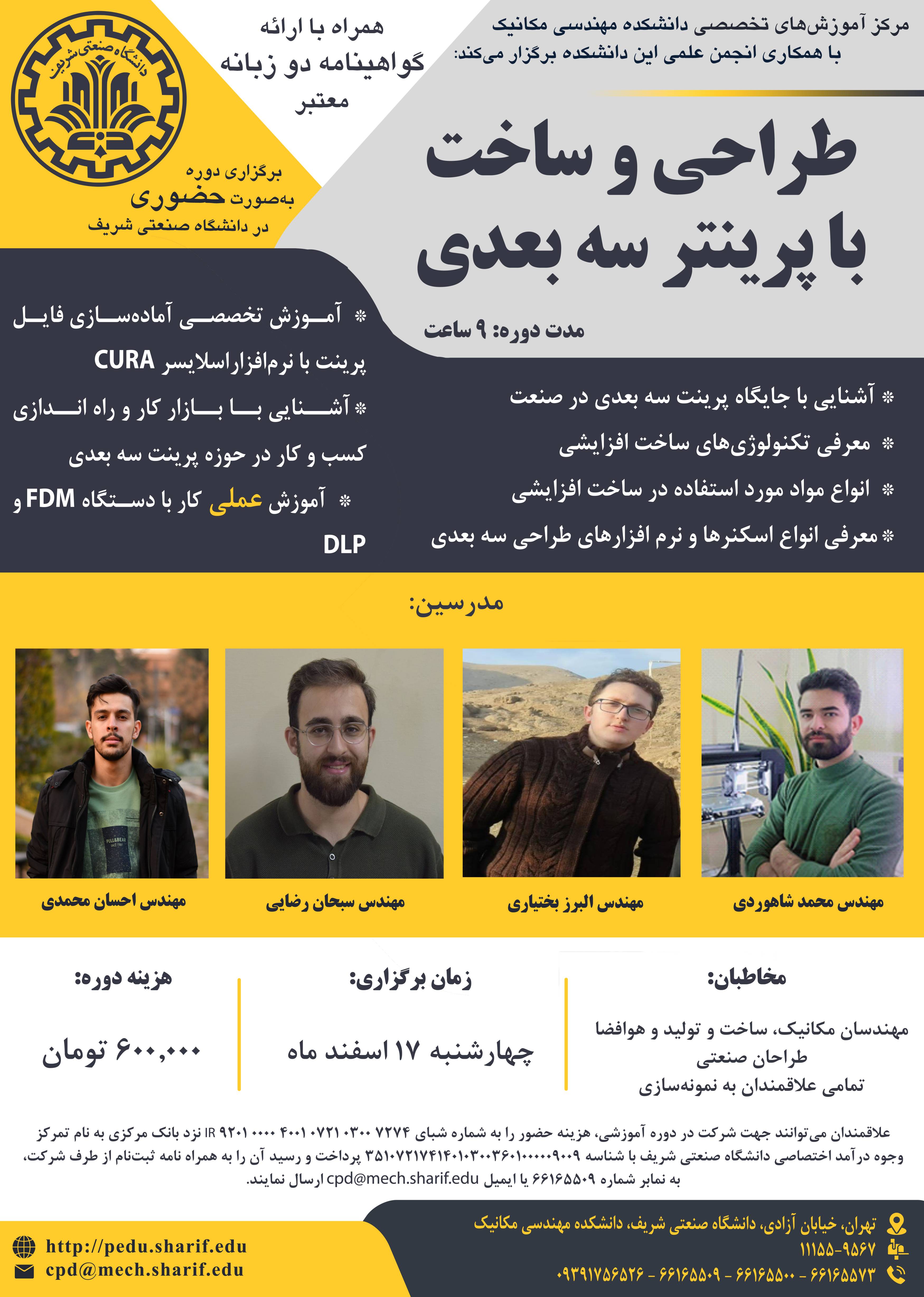 2 و 3 اسفندماه شانزدهمین کنفرانس تخصصی پایش وضعیت و عیبیابی (CMFD 2023) زمان و مکان برگزاری: 2 و 3 اسفند ماه 1401، دانشگاه صنعتی شریف- دانشکده مهندسی مکانیک برنامههای کنفرانس: سخنرانیهای کلیدی-...