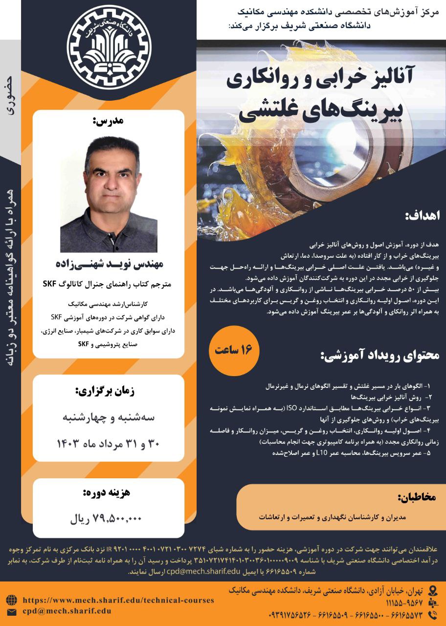 مرکز آموزشهای تخصصی دانشکده مهندسی مکانیک برگزار میکند؛ 《 آنالیز خرابی و روانکاری بیرینگهای غلتشی 》 مدرس: مهندس نوید شهنیزاده ۳۰ و ۳۱ مرداد ماه ۱۴۰۳ همراه با اعطای گواهینامه دو زبانه...