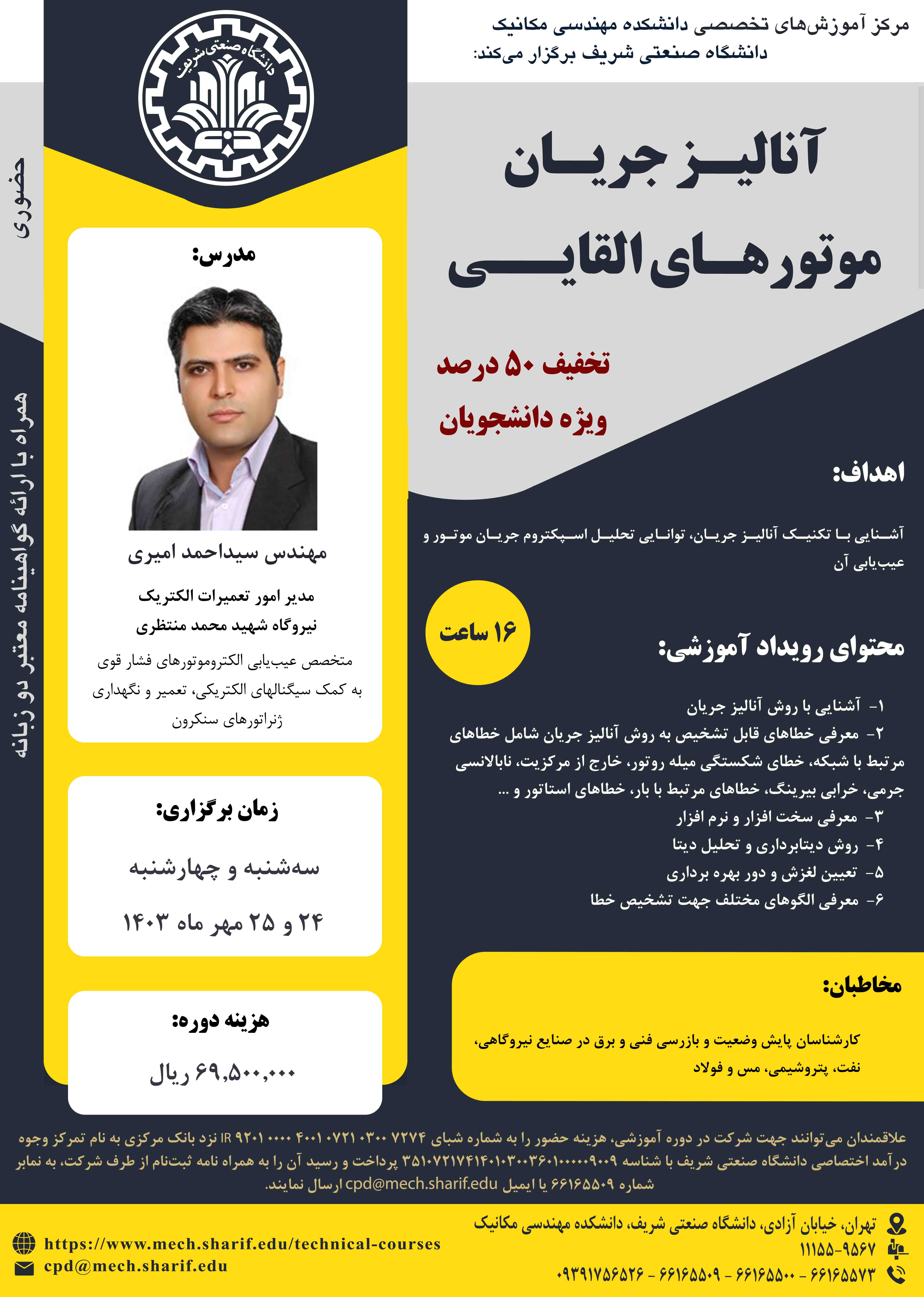 مرکز آموزشهای تخصصی دانشکده مهندسی مکانیک برگزار میکند؛ 《 آنالیز جریان موتورهای القایی 》 مدرس: سید احمد امیری سه شنبه و چهارشنبه، ۲۴ و ۲۵ مهر ۱۴۰۳ همراه با اعطای گواهینامه دو زبانه معتبر...