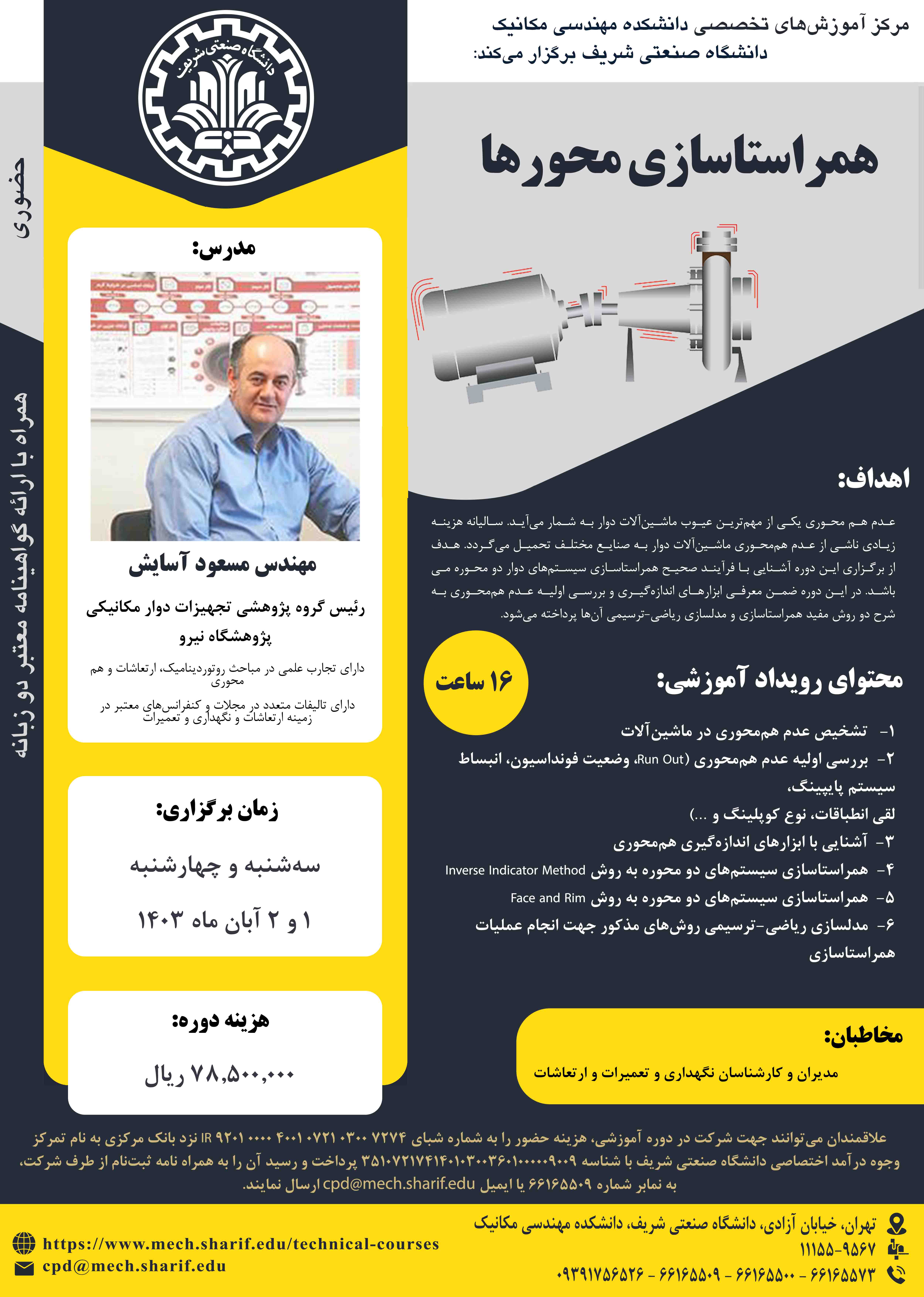 مرکز آموزشهای تخصصی دانشکده مهندسی مکانیک برگزار میکند؛ 《 همراستاسازی محورها 》 مدرس: مهندس مسعود آسایش سه شنبه و چهارشنبه، ۱ و ۲ آبان ۱۴۰۳ همراه با اعطای گواهینامه دو زبانه معتبر از سوی دانشگاه...