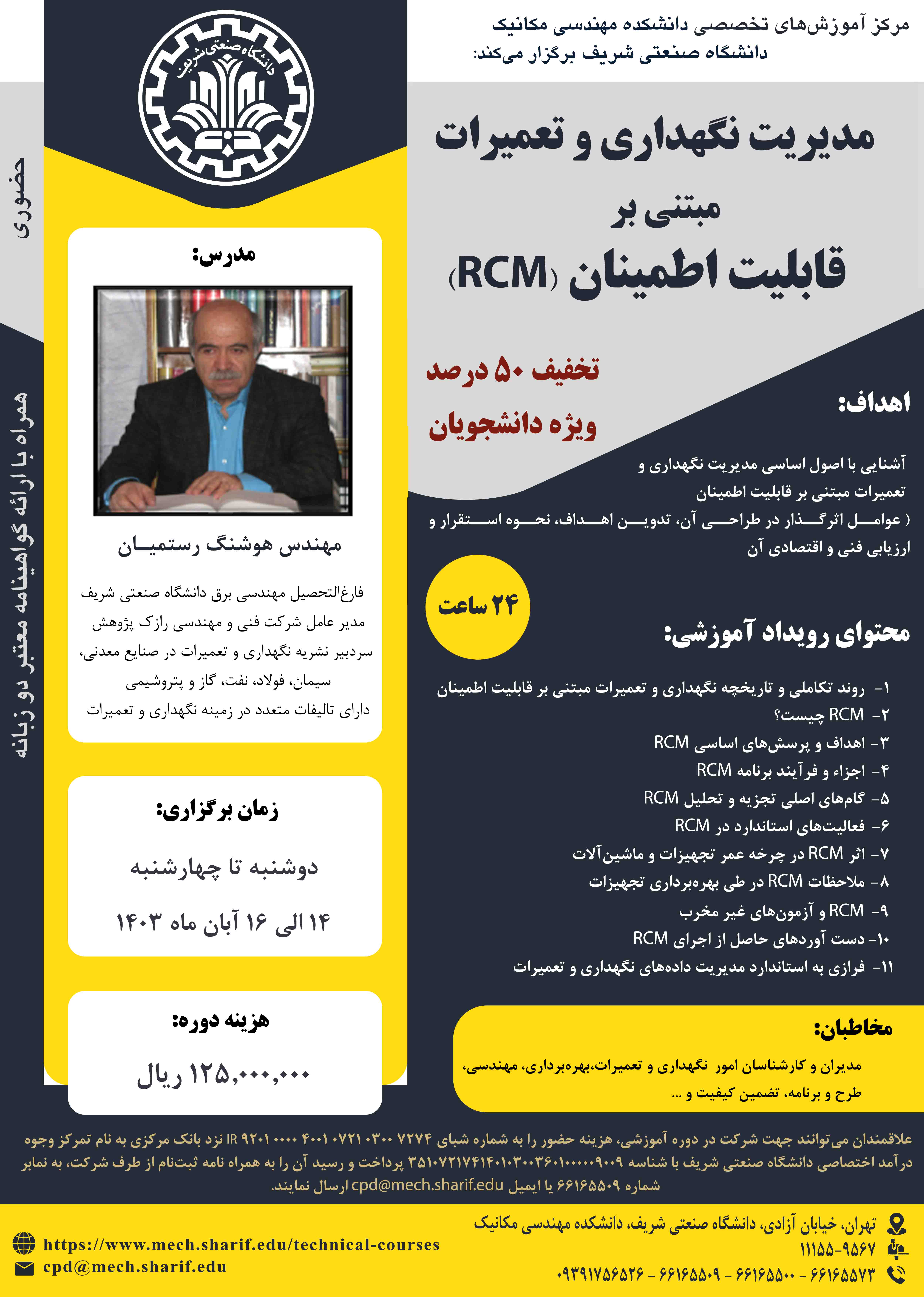 مرکز آموزشهای تخصصی دانشکده مهندسی مکانیک برگزار میکند؛ 《 مدیریت نگهداری و تعمیرات مبتنی برا قابلیت اطمینان (RCM) 》 مدرس: مهندس هوشنگ رستمیان دوشنبه تا چهارشنبه، ۱۴ الی ۱۶ آبان ۱۴۰۳ همراه...