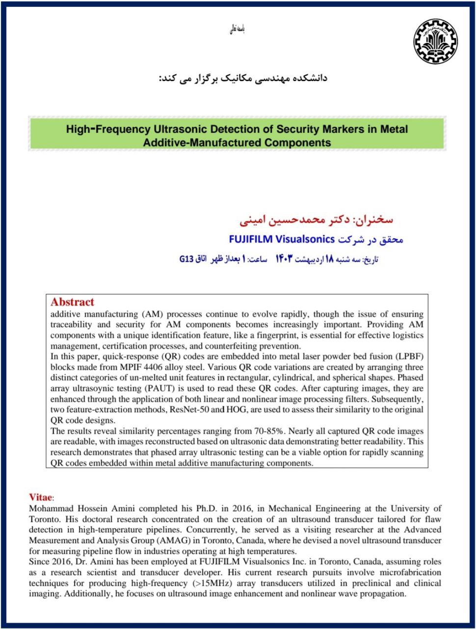 دانشکده مهندسی مکانیک برگزار میکند؛ « High-frequency Ultrasonic Detection of Security Merkers in Metal Additive-Manufactured Components » سخنران: دکتر محمدحسین امینی- محقق شرکت FUJIFILM...