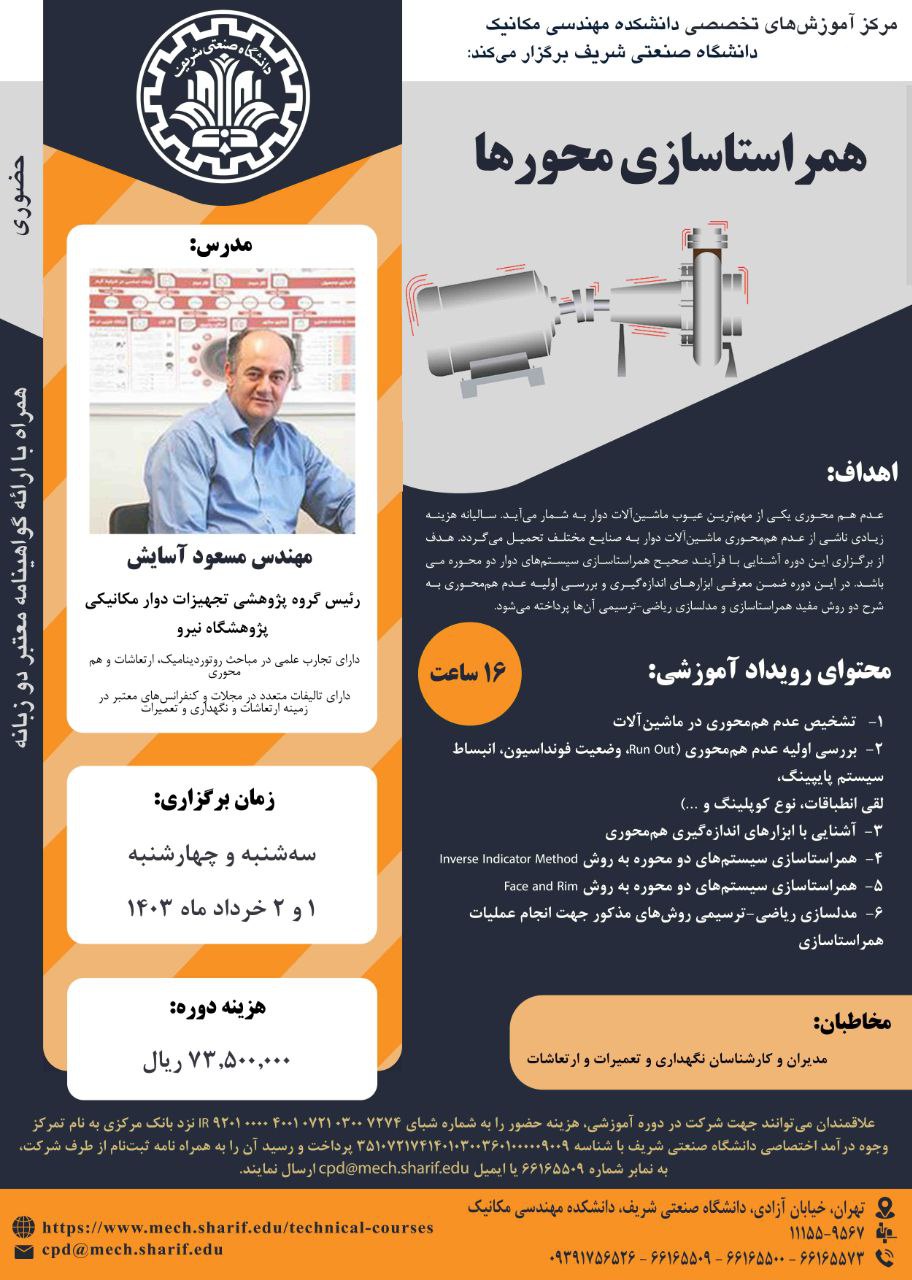 مرکز آموزشهای تخصصی دانشکده مهندسی مکانیک برگزار میکند؛ « همراستاسازی محورها » مدرس: مهندس مسعود آسایش ۱ و ۲ خرداد ماه ۱۴۰۳ همراه با اعطای گواهینامه دو زبانه معتبر از سوی دانشگاه صنعتی...