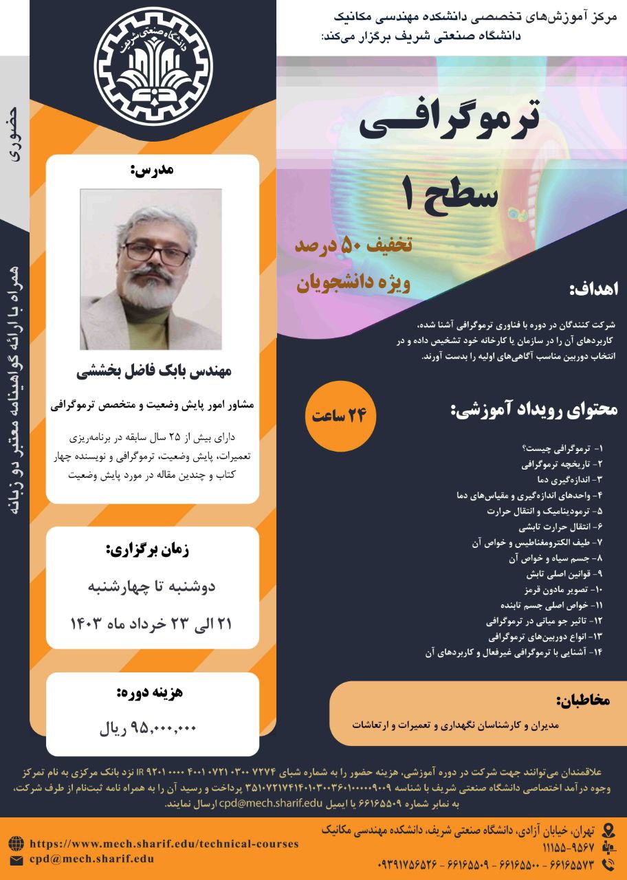 مرکز آموزشهای تخصصی دانشکده مهندسی مکانیک برگزار میکند؛ « ترموگرافی- سطح ۱ » مدرس: مهندس بابک فاضل بخششی ۲۱ الی ۲۳ خرداد ماه ۱۴۰۳ همراه با اعطای گواهینامه دو زبانه معتبر از سوی دانشگاه...