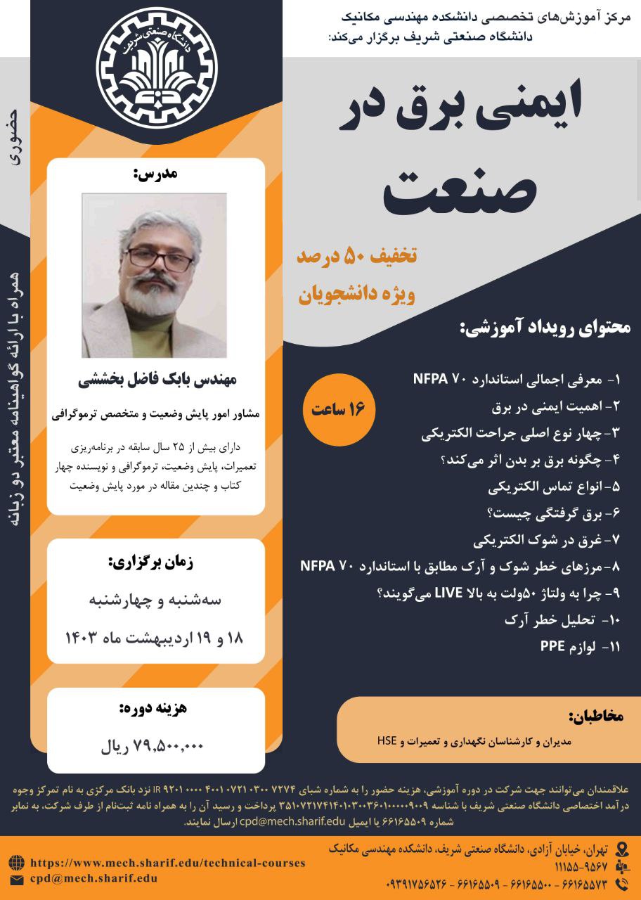 مرکز آموزشهای تخصصی دانشکده مهندسی مکانیک برگزار میکند؛ « ایمنی برق در صنعت » مدرس: مهندس بابک فاضل بخششی ۱۸ و ۱۹ اردیبهشت ماه ۱۴۰۳ همراه با اعطای گواهینامه دو زبانه معتبر از سوی...