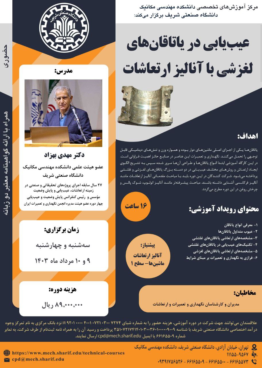 مرکز آموزشهای تخصصی دانشکده مهندسی مکانیک برگزار میکند؛ 《 عیبیابی در یاتاقانهای لغزشی با آنالیز ارتعاشات 》 مدرس: دکتر مهدی بهزاد ۹ و ۱۰ مرداد ماه ۱۴۰۳ همراه با اعطای گواهینامه دو زبانه...