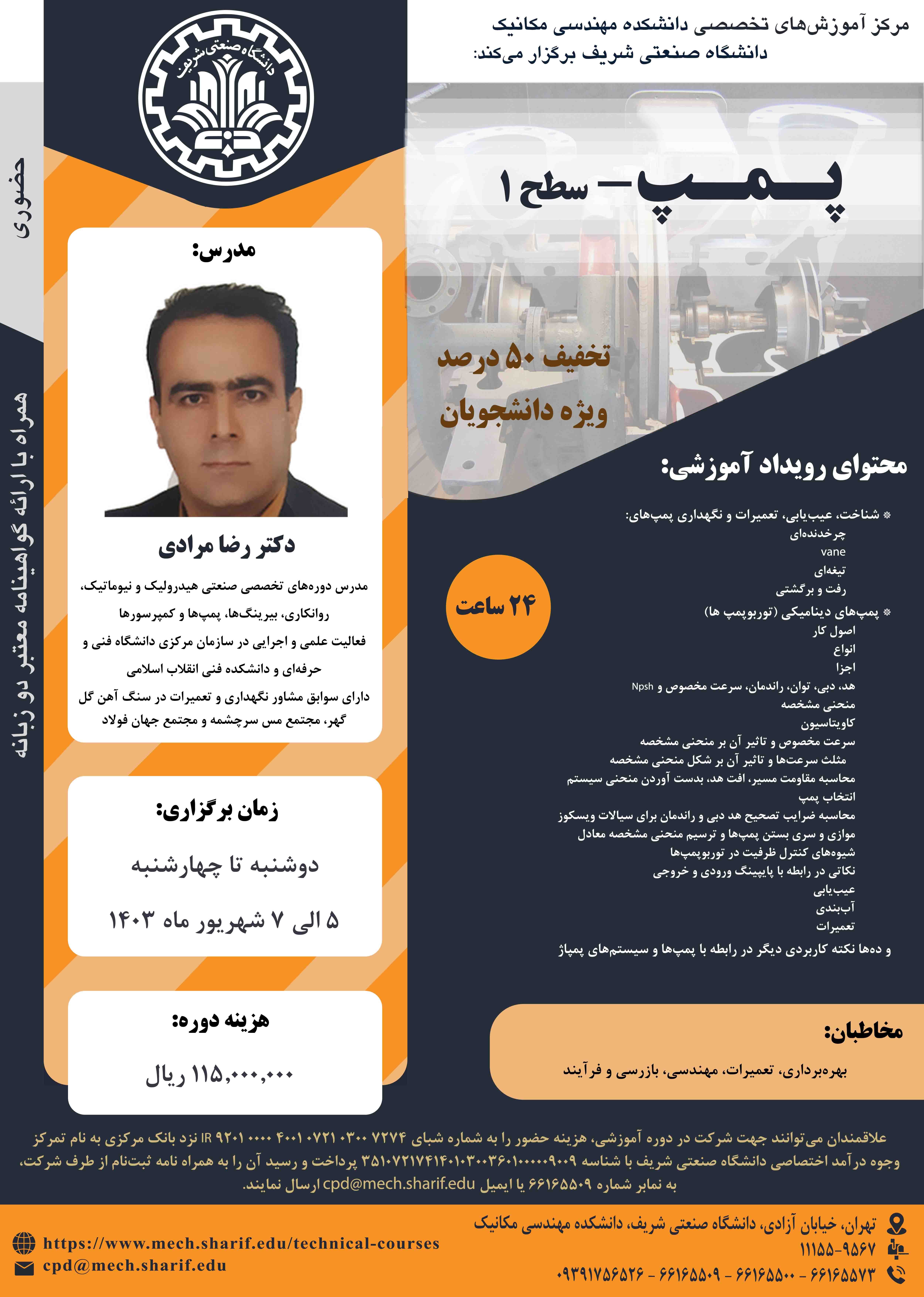 مرکز آموزشهای تخصصی دانشکده مهندسی مکانیک برگزار میکند؛ 《 پمپ - سطح۱ 》 مدرس: دکتر رضا مرادی دوشنبه تا چهارشنبه، ۵ الی ۷ شهریور ۱۴۰۳ همراه با اعطای گواهینامه دو زبانه معتبر از سوی دانشگاه...