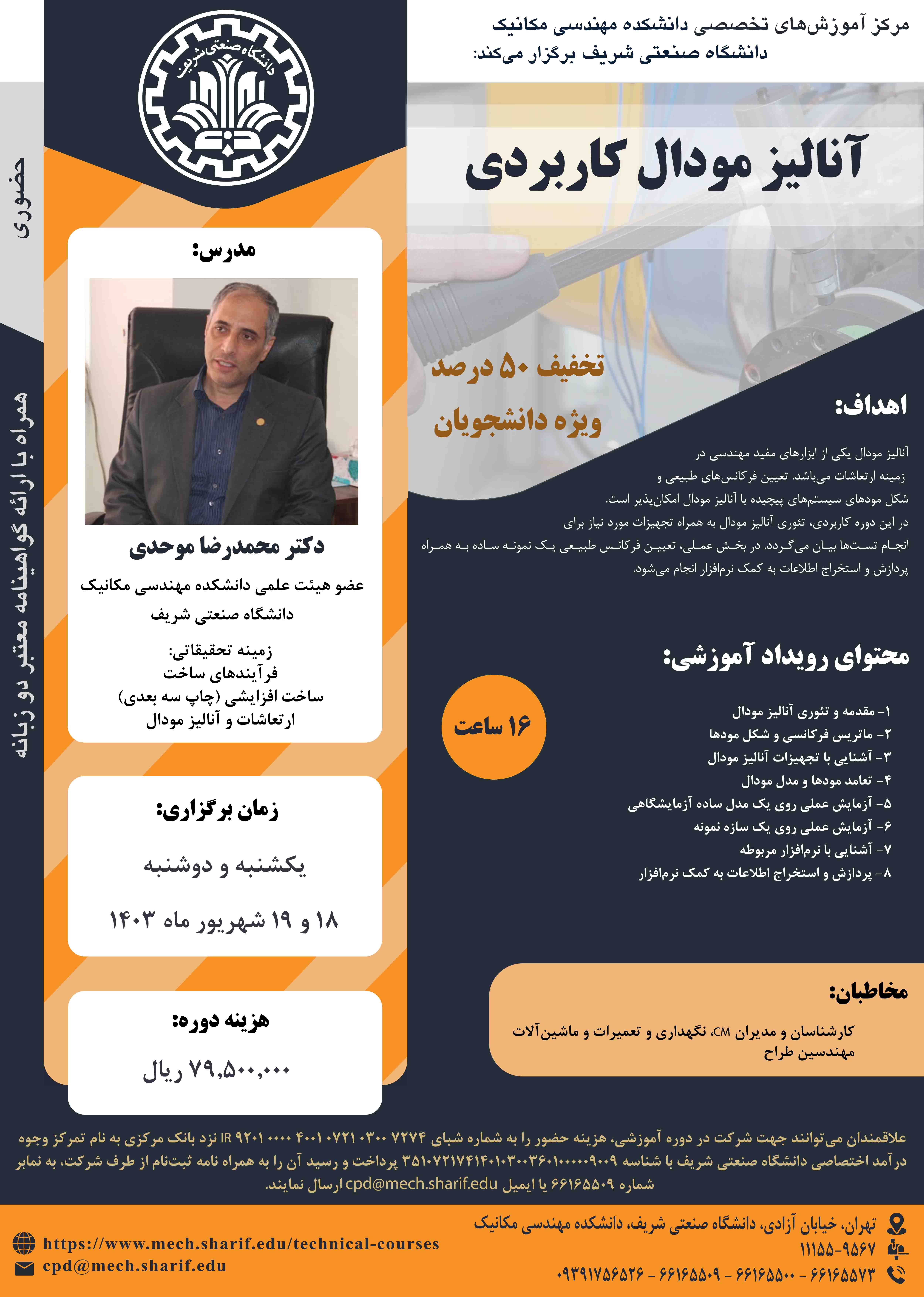 مرکز آموزشهای تخصصی دانشکده مهندسی مکانیک برگزار میکند؛ 《 آنالیز مودال کاربردی 》 مدرس: دکتر محمدرضا موحدی یکشنبه و دوشنبه، ۱۸ و ۱۹ شهریور ۱۴۰۳ همراه با اعطای گواهینامه دو زبانه معتبر از...