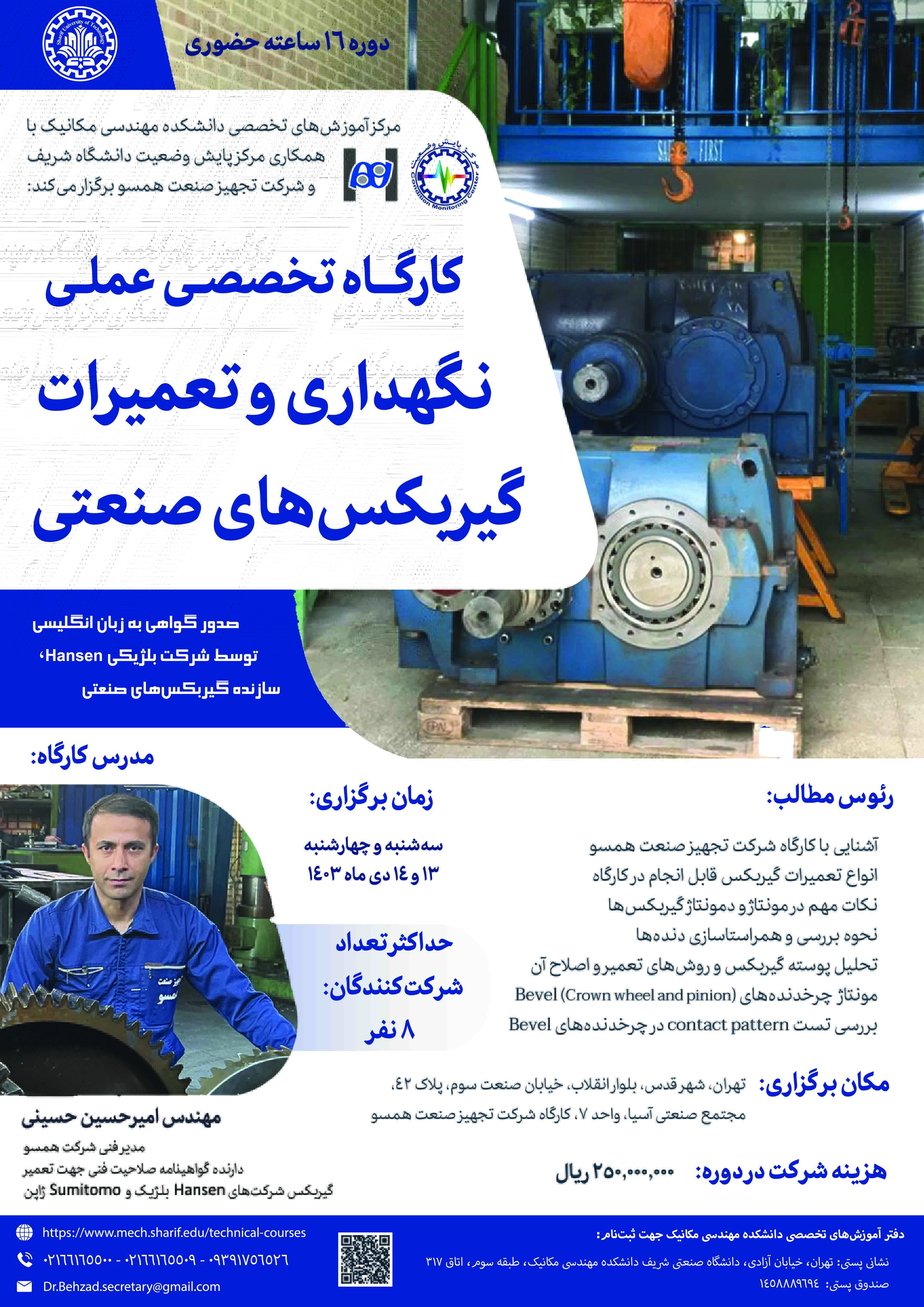 مرکز آموزشهای تخصصی دانشکده مهندسی مکانیک برگزار میکند؛ 《 نگهداری و تعمیرات گیربکسهای صنعتی 》 مدرس: مهندس امیرحسین حسینی سه شنبه و چهارشنبه، ۱۳ و ۱۴ دی ۱۴۰۳ همراه با اعطای گواهینامه دو...