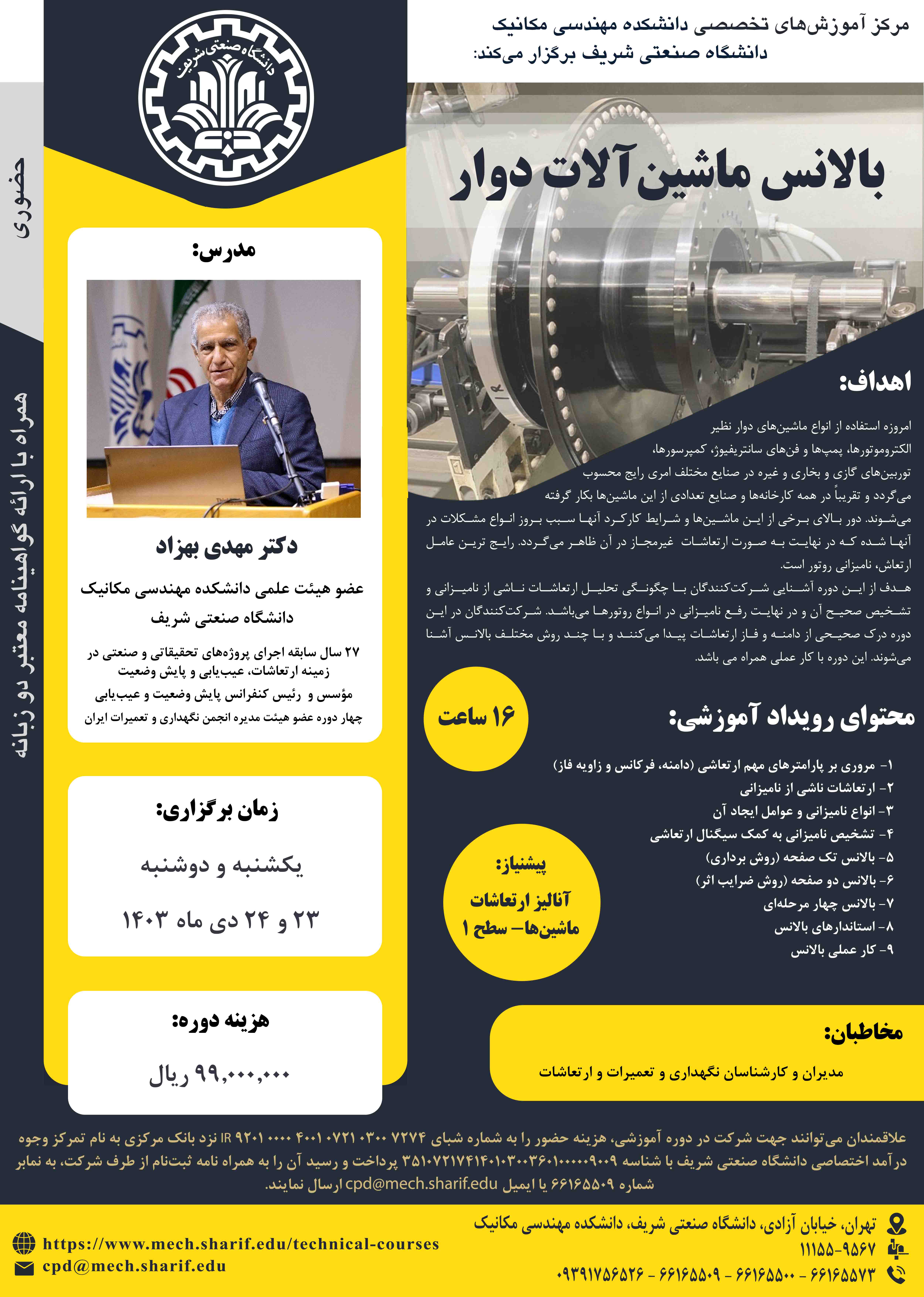 مرکز آموزشهای تخصصی دانشکده مهندسی مکانیک برگزار میکند؛ 《 بالانس ماشینآلات دوار 》 مدرس: دکتر مهدی بهزاد یکشنبه و دوشنبه، ۲۳ و ۲۴ دی ۱۴۰۳ همراه با اعطای گواهینامه دو زبانه معتبر از سوی...