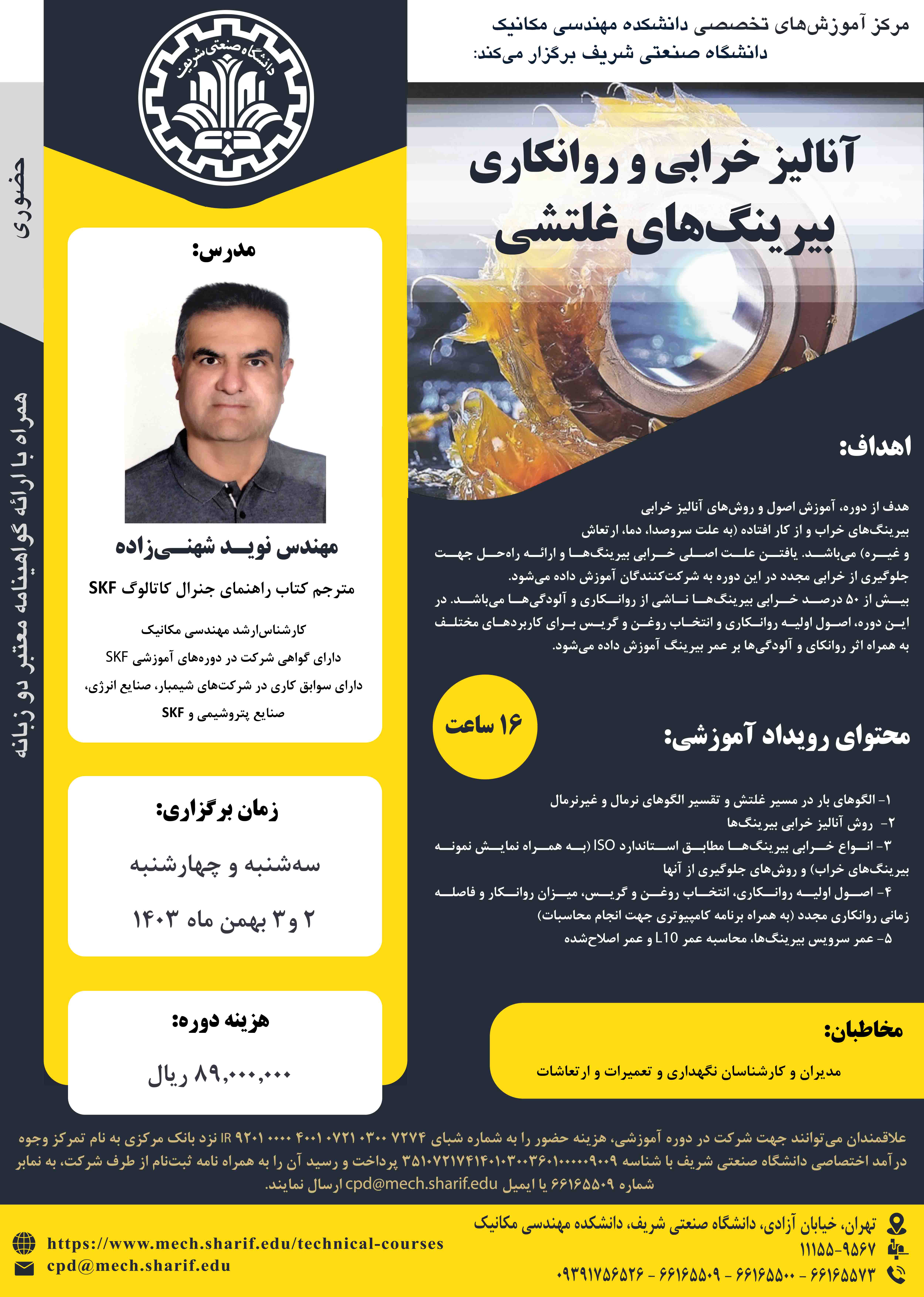 مرکز آموزشهای تخصصی دانشکده مهندسی مکانیک برگزار میکند؛ 《 نگهداری و تکنولوژی بیرینگهای غلتشی》 مدرس: مهندس نوید شهنیزاده سه شنبه و چهارشنبه، ۱۱ و ۱۲ دی ۱۴۰۳ همراه با اعطای گواهینامه دو...