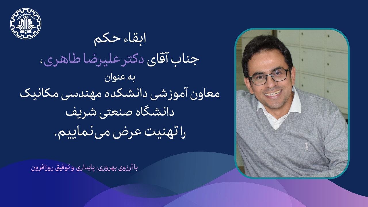 ابقای حکم جناب آقای دکتر علیرضا طاهری به عنوان معاونت آموزشی دانشکده مهندسی مکانیک