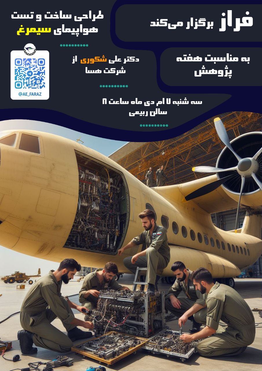 سمینار طراحی، ساخت و تست هواپیمای سیمرغ سخنران: دکتر علی شکوری از شرکت هسا سه شنبه ۷ دی ماه ساعت ۸ مکان برگزاری جلسه: سالن ربیعی