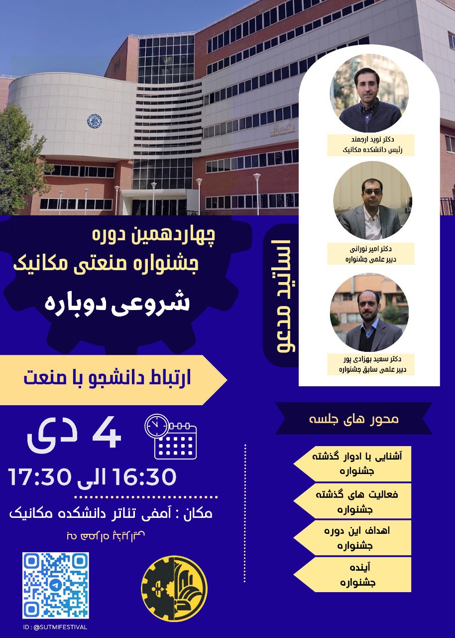 برنامه هفته پژوهش و فناوری دانشکده مهندسی مکانیک دانشگاه صنعتی شریف شامل ۵ وبینار از ۲۷ آذر الی ۲ دی ماه و مراسم حضوری در تاریخ ۳ دی ماه از ساعت ۱۳ در آمفیتئاتر دانشکده مهندسی مکانیک