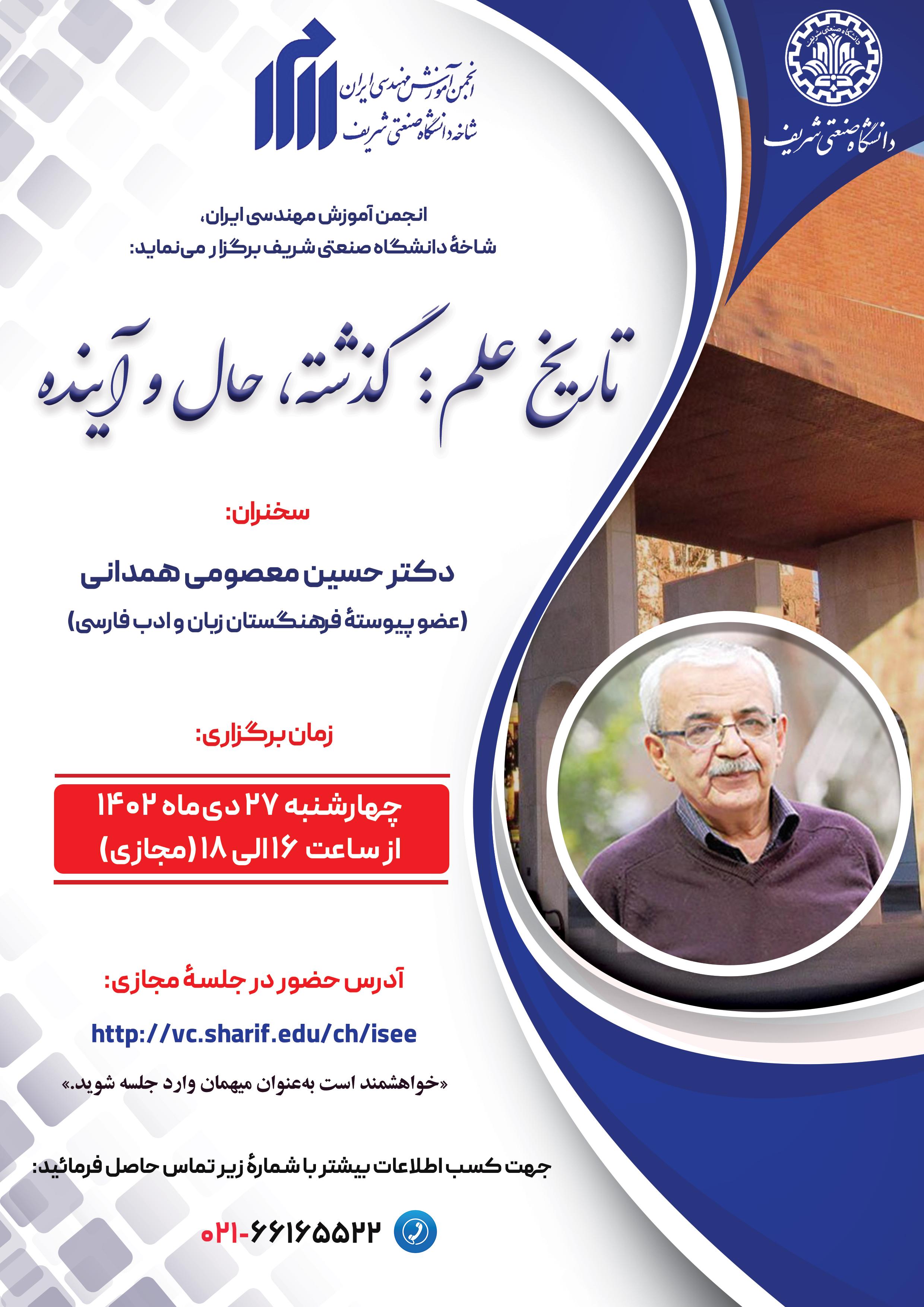 برگزاری همایش "تاریخ علم: گذشته، حال و آینده" برگزاری همایش "تاریخ علم: گذشته، حال و آینده" توسط انجمن آموزش مهندسی ایران، شاخه دانشگاه صنعتی شریف. اطلاعات تکمیلی در فایل پیوست قابل مشاهده است....