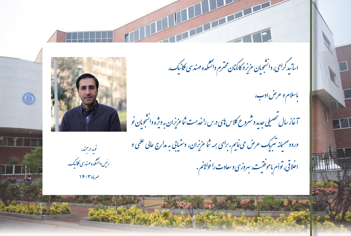 پیام تبریک ریاست محترم دانشکده مهندسی مکانیک، به مناسبت آغاز سال تحصیلی جدید