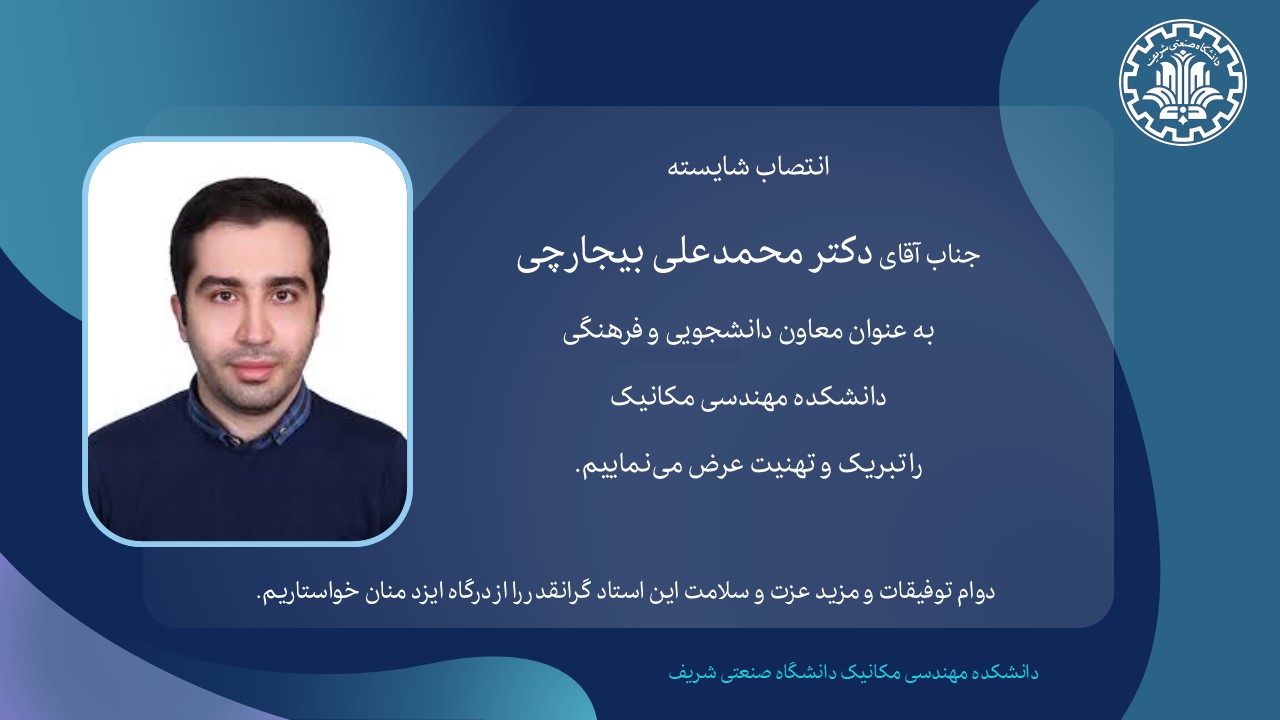 انتصاب جناب آقای دکتر محمدعلی بیجارچی به عنوان معاون دانشجویی و فرهنگی دانشکده مهندسی مکانیک
