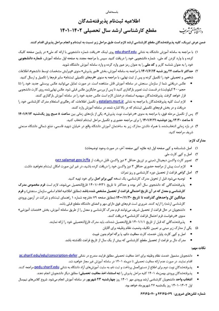 کلیه پذیرفتهشدگان مقطع کارشناسی ارشد لازم است. اطلاعات اولیه خود را حداکثر تا روز شنبه ۱۲ شهریور در سامانه آموزش دانشگاه تکمیل نموده و سپس با تعیین نوبت مراجعه، بین روزهای یکشنبه ۱۳ شهریور تا دوشنبه ۲۱ شهریورماه برای تحویل حضوری مدارک و تکمیل ثبتنام به ساختمان آموزش دانشگاه مراجعه نمایند.