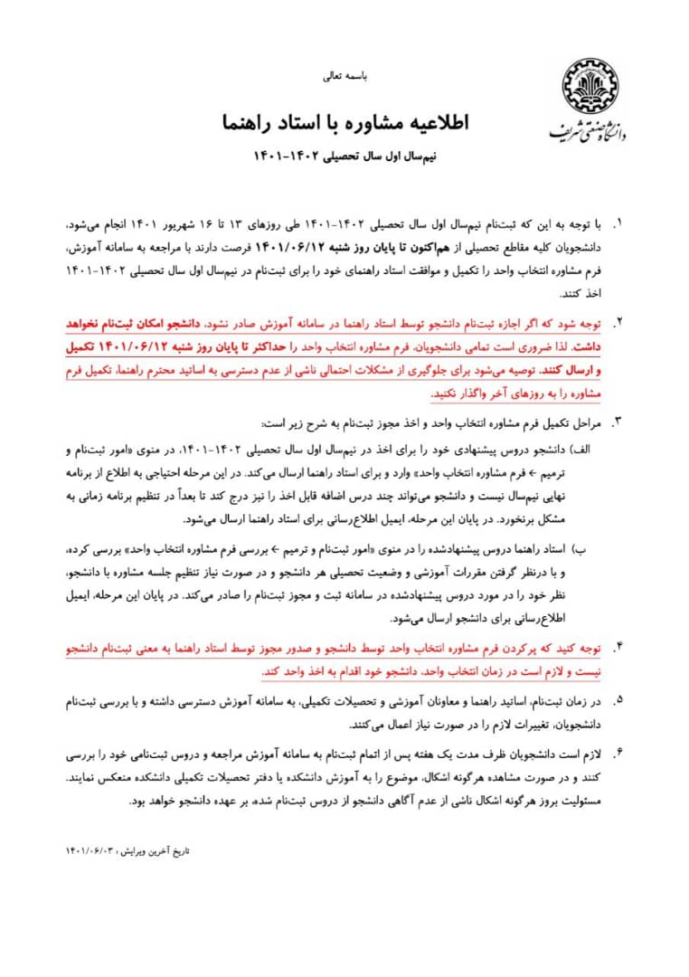 دانشجویان کلیهی مقاطع لازم است حداکثر تا پایان وقت اداری روز شنبه ۱۲ شهریورماه فرم مشاوره انتخاب واحد را تکمیل و ارسال کنند تا مجوز ثبتنام ایشان در نیمسال اول ۱۴۰۲-۱۴۰۱ توسط استاد راهنما صادر شود.