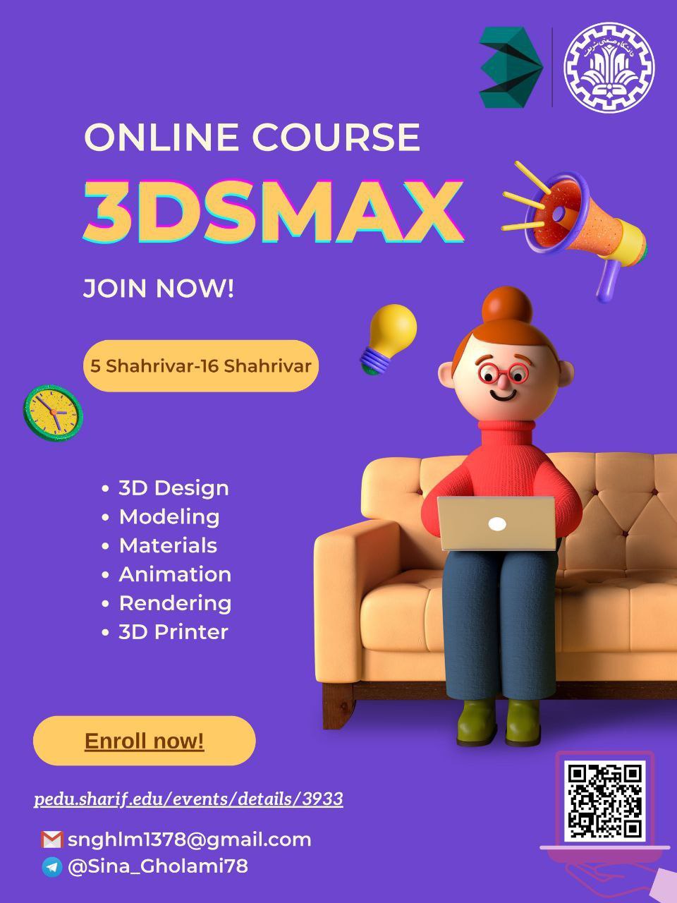 دوره آموزشی 3DSMAX مرکز آموزش های آزاد دانشگاه صنعتی شریف برگزار می کند: دوره آموزشی آنلاین نرم افزار 3DsMAX با تدریس آقای سینا غلامی این دوره که از ۵ شهریور ماه تا ۱۶ شهریور ماه به صورت مجازی...