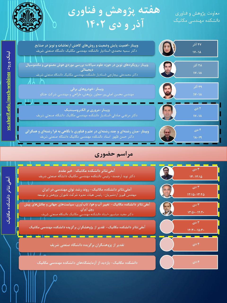 برنامه هفته پژوهش و فناوری دانشکده مهندسی مکانیک دانشگاه صنعتی شریف شامل ۵ وبینار از ۲۷ آذر الی ۲ دی ماه و مراسم حضوری در تاریخ ۳ دی ماه از ساعت ۱۳ در آمفیتئاتر دانشکده مهندسی مکانیک