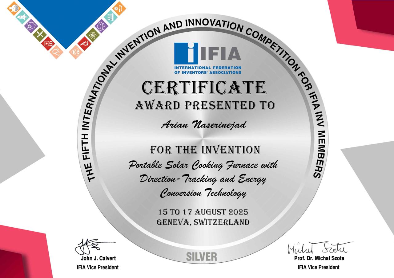 کسب مدال نقره توسط آرین ناصرینژاد در پنجمین دوره مسابقات بینالمللی اختراع و نوآوری فدراسیون جهانی مخترعین (IFIA) آرین ناصری نژاد: دانشجوی مهندسی مکانیک دانشگاه صنعتی شریف (پردیس بینالملل کیش)...