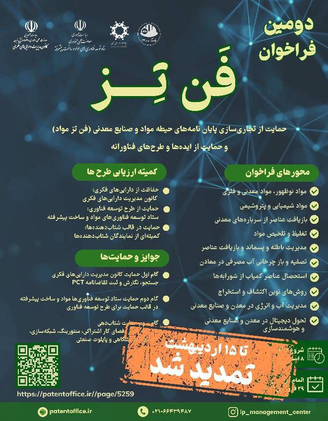 تمدید مهلت ثبتنام در فراخوان فن تز با هدف حمایت از تجاریسازی پایاننامهها در زمینه مواد و صنایع معدنی مهلت ثبتنام در فراخوان فن تز با هدف حمایت از تجاریسازی پایاننامهها در زمینه مواد و...