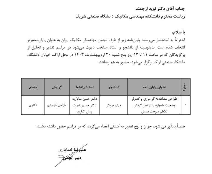 پایاننامه دکتری جناب آقای مهندس میثم جوکار، دانشجوی آقایان دکتر سالاریه و دکتر نجات، به عنوان پایاننامه برتر ایران انتخاب شد ضمن عرض تبریک بسیار و آرزوی موفقیت روزافزون، پایاننامه دکتری جناب...